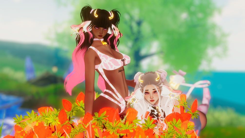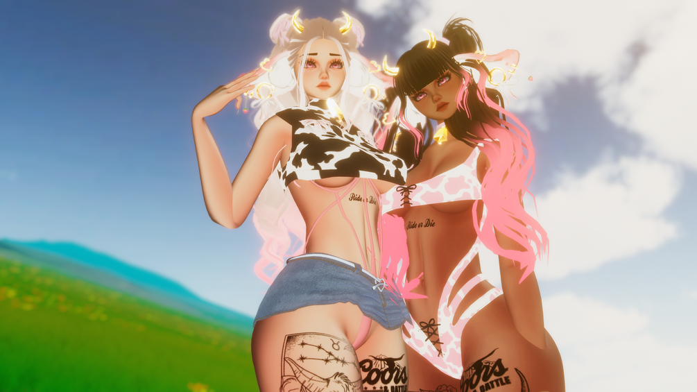 𝘊𝘙𝘌𝘋𝘐𝘛𝘚: Body/Head NO REUSE MY EDIT: Sugs#9795 and Head Texture (Sivka#3788), Body Texture (Ying#6669 Yang#6669) Tattoos by ME, Curly Bun Hair (Nessy!#7402), Cow Ears( Nessy!#7402), PonyTails (Saikura#0006), Strawberry Gag (juuul#3822), String Bodysuit (moobean#8827), Milky Heels (MEEVA#7739), Cow Bell (Jess#5678), Heels (Milky Mommy#6969), Cow Top and Skirt (rinebean#1111), Horns and Tail (bakuuwu.#1703), Bodysuit (loki#3000), Heart Particles (bunky#0001), Milk (Schromi#0001), Hearts On Head (Gemini#4086), Gogo Loco (frandavrc).